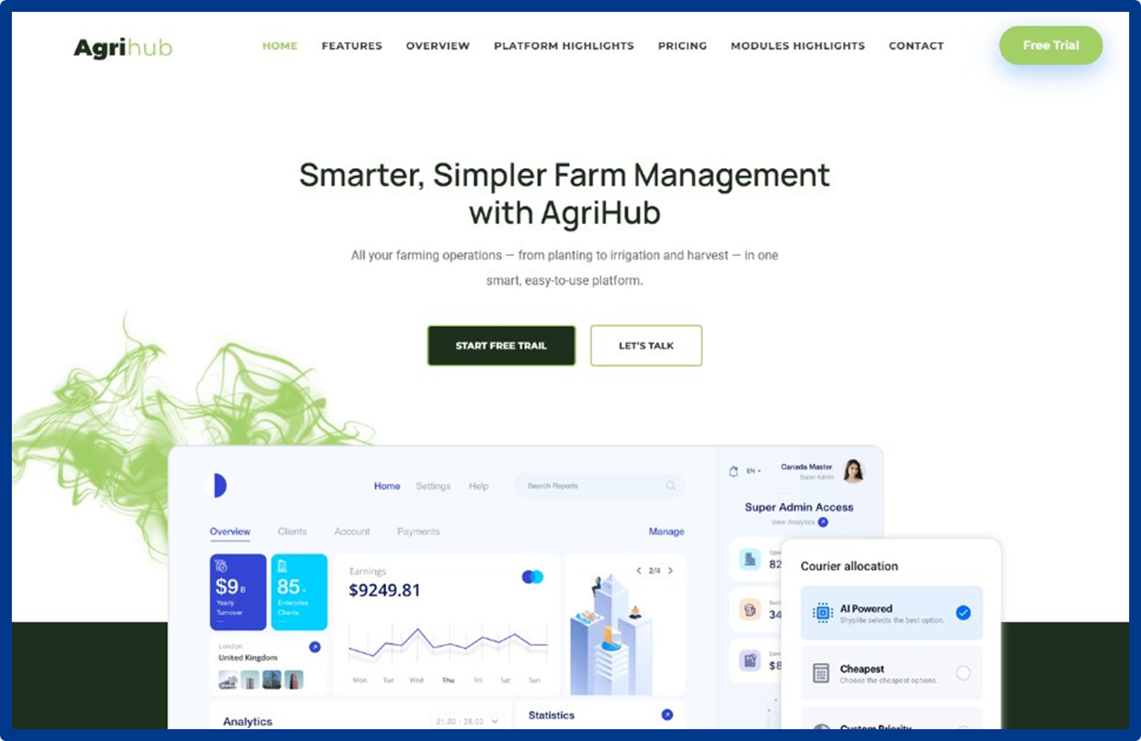 AgriHub is a Dubai based farm management platform that brings crop planning, irrigation control, task and workforce management, inventory and sales, HR and asset maintenance into one simple, mobile friendly system with dashboards, forecasts and interactive maps. The company offers a free trial and paid plans, and operates from in5 Tech at Dubai Science Park