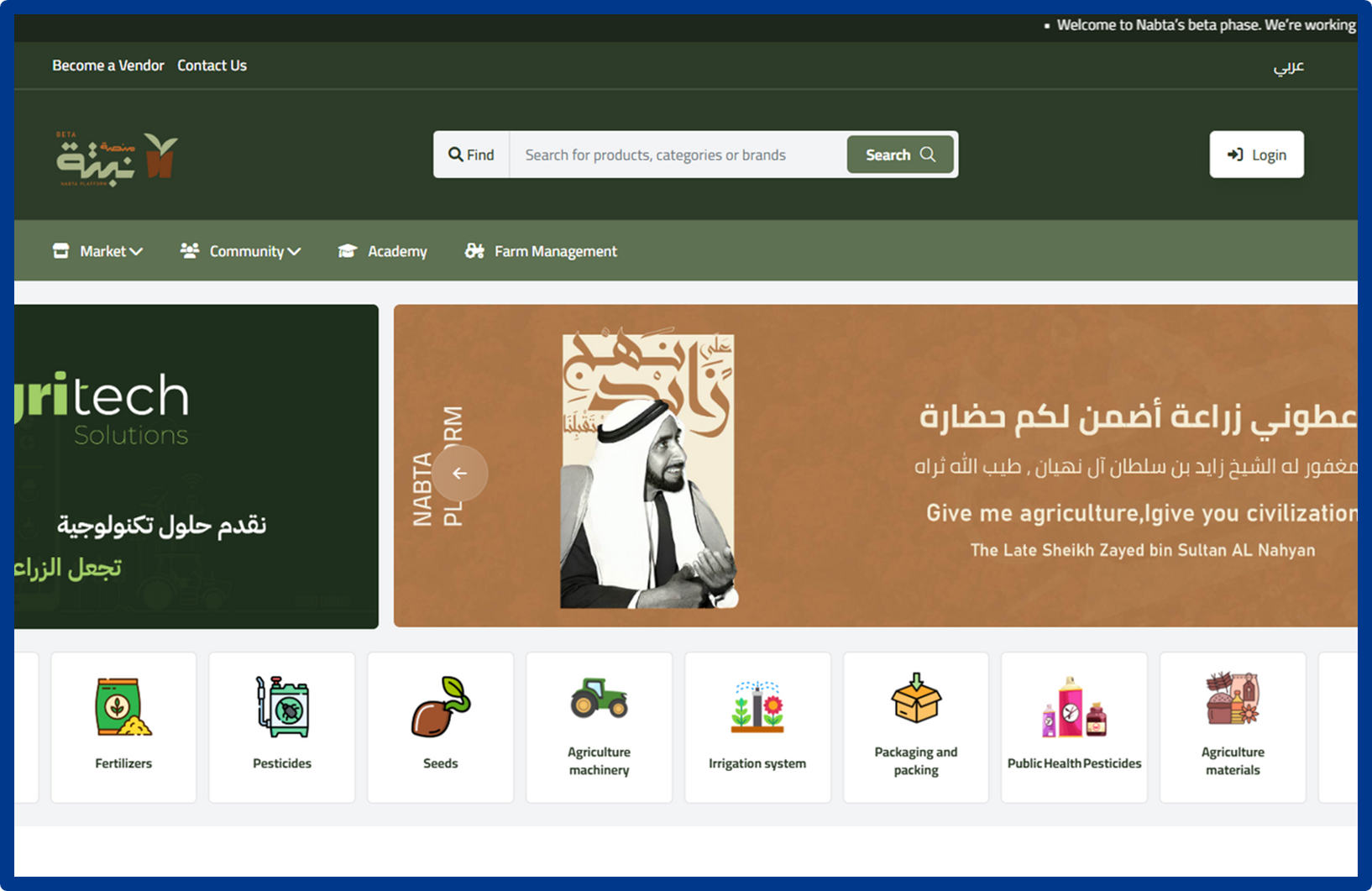 Nabta is an integrated agritech platform that unifies farm management, a B2B open market, and an academy, enabling growers and agri vendors to manage operations, trade inputs and produce, and build skills across the UAE ecosystem, centered in Dubai, UAE. Built by Agritech Solutions FZ-LLC, the platform is in open beta and features vendor onboarding, practical training programs, and a community hub for field tips and advice.