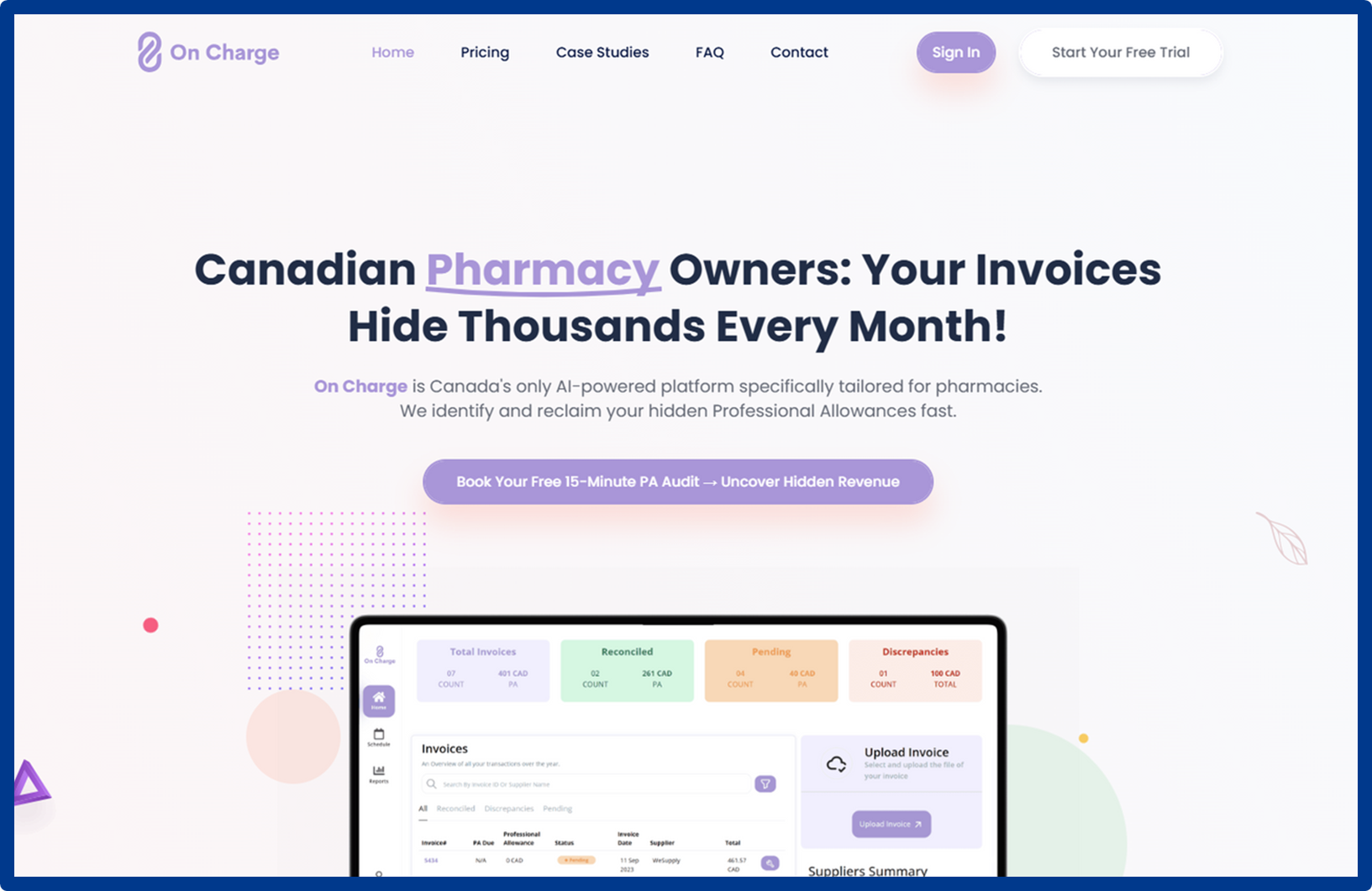 On Charge is Canada’s only AI-driven platform built specifically for pharmacies, designed to identify and reclaim hidden Professional Allowances (PAs) with accuracy and speed.