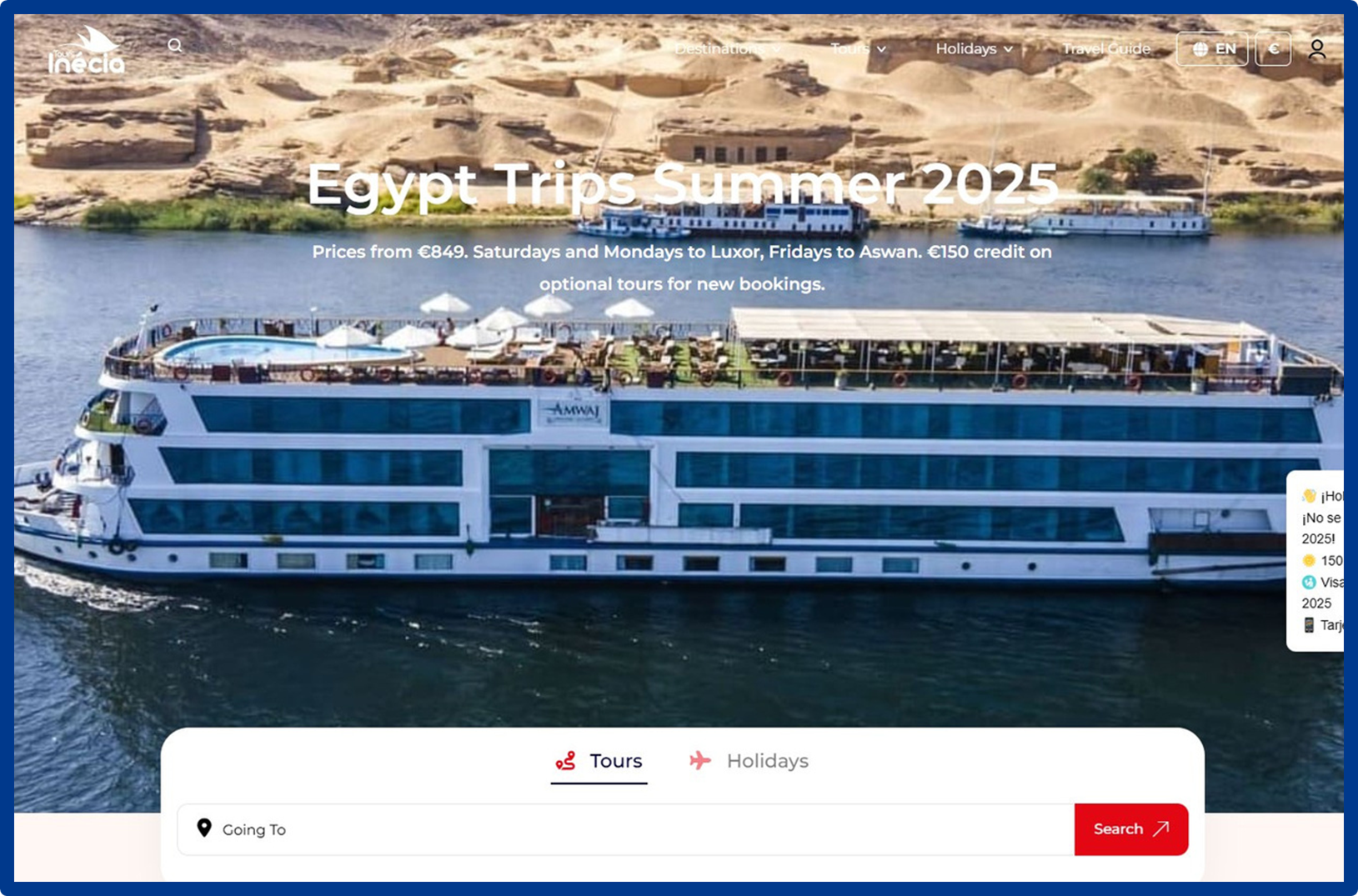 Inécia Tours is a Spain-founded destination management company that designs Egypt-forward trips for Spanish travellers, uniting flight and hotel booking, organized excursions, and expert guides to deliver value-packed itineraries across Egypt, Morocco, Spain, and Turkey, centred out of Spain with on-the-ground operations in Egypt